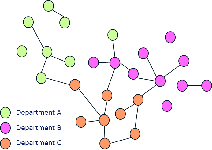 From there, a number of uses suggest themselves. Different pieces of data can be overlaid on the network to to see if structure in the network corresponds to specific things like department or role or age. This could provide a measure of whether the organization is functioning as expected. For example, if the organization values low barriers between departments and collaboration, the following picture of the network might suggest a need to do more to promote cross-department interactions.