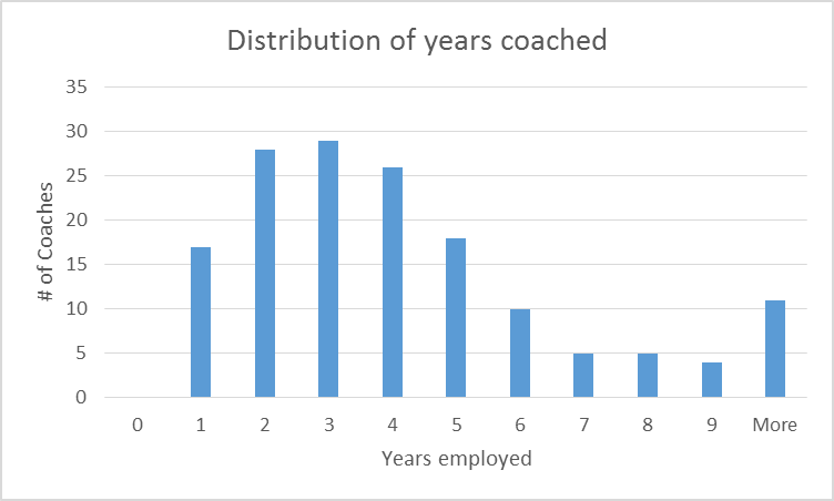 What about proprietary information? It’s true that trade secrets can be a useful way to maintain market share. But in sports leagues, just like in many other business sectors, personnel churn is the norm. A USA Today article from 2012 has a nice table of the average tenure of the past five managers or head coaches for each team across the NFL, MLB, NBA and NHL. It won’t surprise anyone to note that the median is just a few years across sports. I took the data from the NFL coaches table and created a simple frequency histogram to show the distribution of coaching tenures among the 32 NFL teams over the last five positions tracked in the USA Today study: