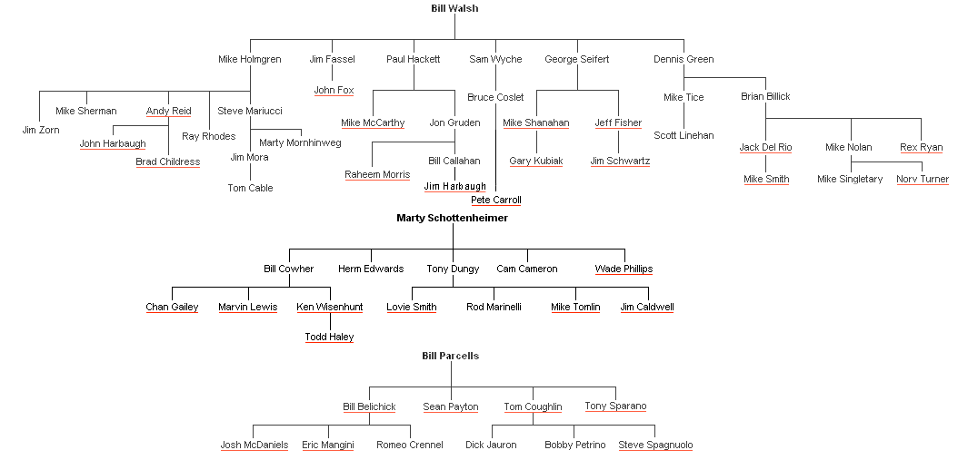 Given that head coaches generally don’t last long, and that their staffs also are subject to turnover on a regular basis, it’s difficult to argue that there can really be anything like long term trade secrets in the major sports leagues. At best there might be a few years of advantage but once a team shows success, that leads to the spread of ideas as coordinators and assistant coaches move out to lead their own groups. Check out these coaching trees, courtesy of Wikipedia:
